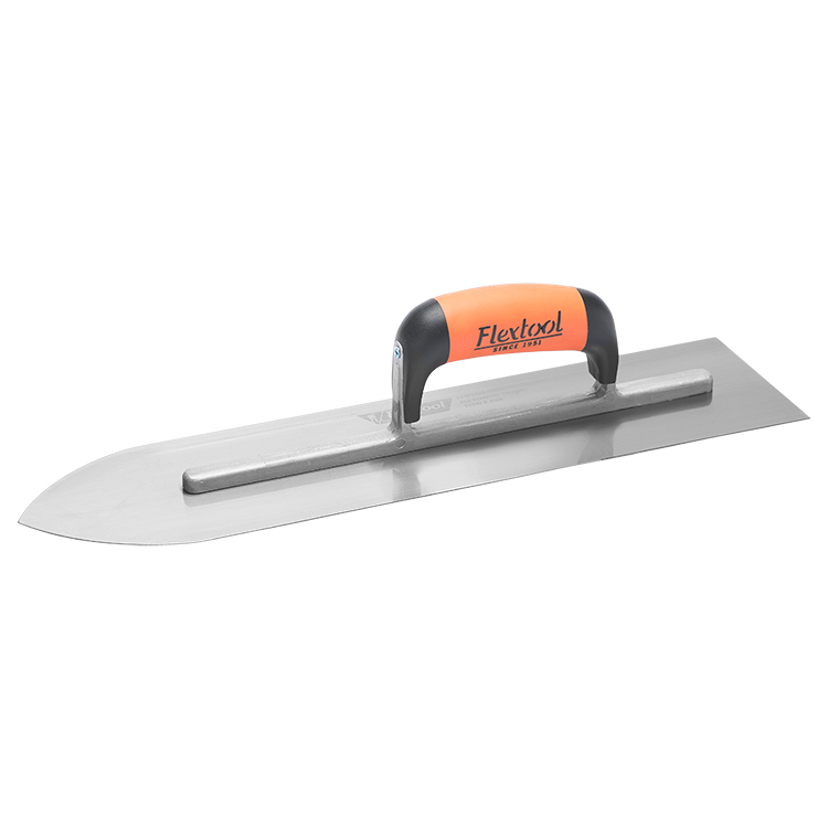 Flextool Pointed Trowel is designed for trowelling concrete floors and other general concrete work. It is fabricated from high carbon steel to optimise blade flexibility and durability. The pointed nose of the trowel provides flexibility when trowelling around corners and protrusions in the concrete, and reduces the risk of marks being left in the concrete. The Flextool Pointed Trowel is fitted with a single-piece forged aluminium spine for extra strength and blade support, and features a ProSoft rubber grip handle for user comfort.
