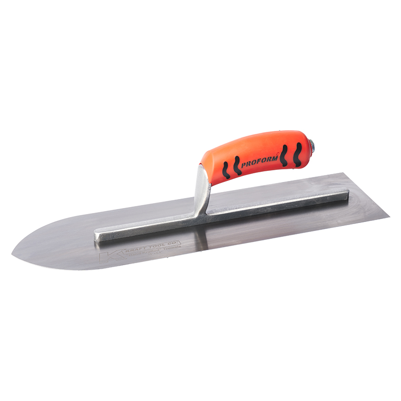 Kraft Tool Co Pointed Trowels Carbon Steel are designed for trowelling concrete floors and other general concrete work. The high-flex carbon steel blade offers durability and flexibility, with a pointed front for corners and angles and a square back for finishing along edges and corners. Lightweight aluminium mounting ensures strength, while the ProForm soft grip handle provides comfort and a secure grip during use, even when wet.