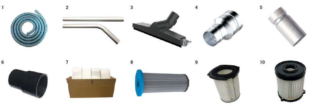 - Accessories include a hose, aluminium wand, floor nozzle, reducer, hose cuff, bagging system and H-Class HEPA filters